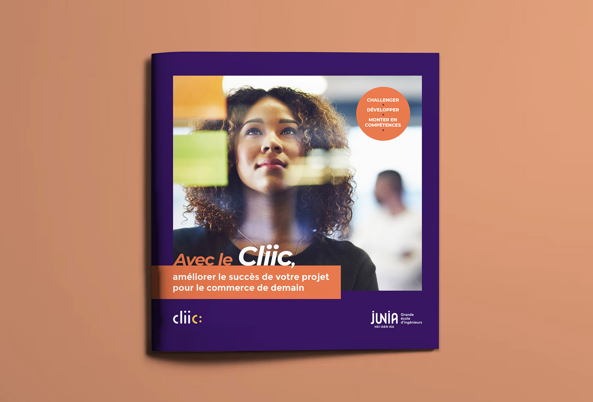 En 2020, la Grande école d'ingénieurs Junia a lancé le Cliic (Créer avec le Laboratoire d'Ingénierie et d'Innovation pour le Commerce), un lieu dédié à la rencontre entre commerçants, habitants du quartier, clients, enseignants, étudiants, chercheurs et entreprises. Le Cliic a pour objectif de les accompagner dans leurs projets d’innovation en s’appuyant sur la formation, le conseil ou la recherche et le développement. Dans un premier temps, j'ai créé l’identité graphique du Cliic basée sur un logotype minimaliste mêlant "technologie" via un lettrage simple et épuré et "expérience client" illustré par le smiley. J'ai réalisé ensuite des supports de communication (une plaquette de présentation et un flyer destiné aux commerçants) pour renforcer la notoriété croissante du Cliic sur le territoire bordelais.